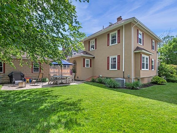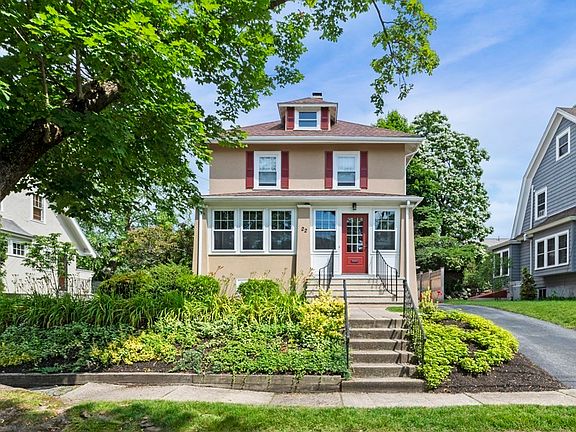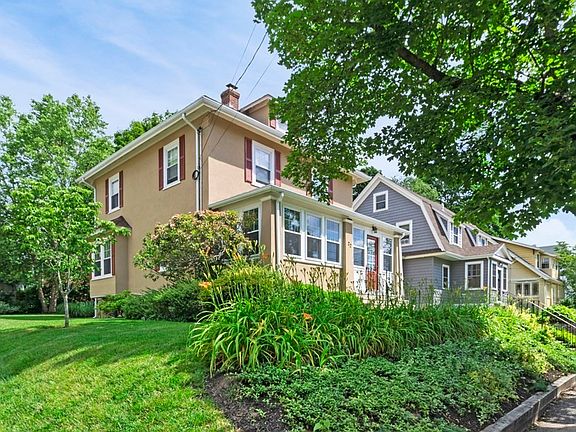 Prime West Medford location. You will love this delightful Colonial with 7 rooms, 3 bedrooms, 2.5 baths in move-in condition. Begin with the very useful 3-season front porch that serves as an extra room. The generously-sized living room has a wood-burning fireplace and is broadly open to the formal dining room with chair rail. A 2019 stunning white kitchen was added with gleaming high-end hardware, a water filter tap, SS appliances, gas stove with hood; gray and white quartz counters and peninsula bar, radiant heated floor; a discreetly located half bath, and built-ins. On the second floor, three attractive bedrooms have ceiling fans (there is central AC, too) and share a classic bathroom. The handsome lower level makes a wonderful flex room; the bathroom with shower has a washer and dryer closet. An exterior of long-life stucco with color embedded was applied in 2019; the fenced grounds with a separate irrigation meter are lush. Garage+ pkg. The train, shops, parks are minutes away.