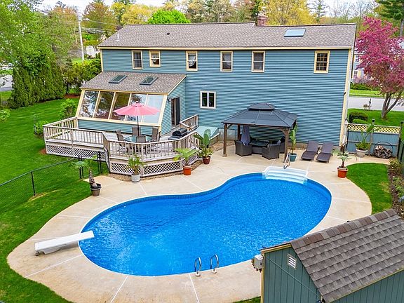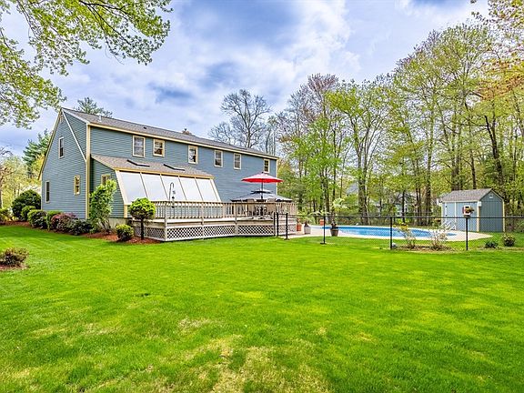 Welcome to this impeccably maintained 4-bedroom, 2-bath New England cape, nestled in a sought-after Jamestown Commons neighborhood. This desirable floor plan offers a cathedral ceiling in the sunlit living room w/ bow window and pellet stove. The kitchen is features granite countertops, recessed lighting, pantry, breakfast bar and the dining room opens up to a heated sunroom. A full bath & extra bedroom/office space complete the main level. The second floor features 3 generously sized bedrooms and a full bath with dual access from hall and bedroom. The partially finished lower level offers a game/family room and plenty of storage in the unfinished space. Enjoy the hot tub in the sunroom with views of the private yard. Spend summers in the backyard entertaining while enjoying the in ground pool, deck! Storage shed and two-car garage with plenty of parking. All nicely sited and landscaped. Convenient to shopping, restaurants, Routes 117, 190, 2 and the MBTA commuter rail station