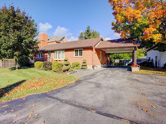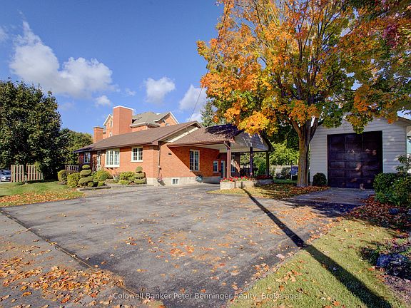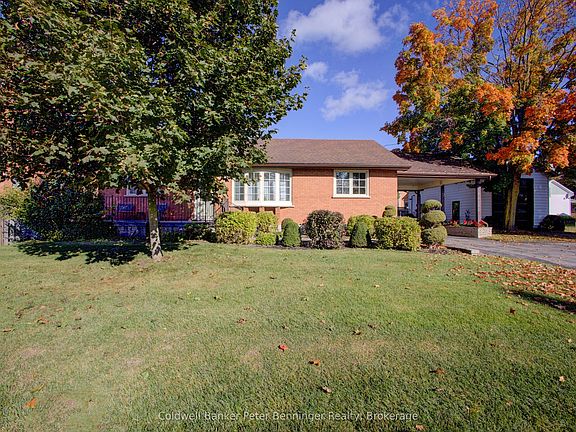 Attractive and well maintained updated bungalow in Tara. Main floor living featuring updated kitchen, living room with gas fireplace, den/office, 2 bedrooms, 2 full bathrooms and laundry. Walkout to large attached deck with covered gazebo. Basement is partially finished featuring large rec room with cozy gas stove and with potential for 3rd bedroom. Private yard is partially fenced. Carport and large paved driveway. In addition there is a detached 18' x 34' garage/workshop, it is insulated and heated with natural gas. Also 2 smaller garden sheds.