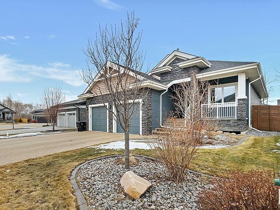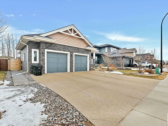 Welcome to Kenton Woods, one of Spruce Grove's most sought-after crescents, renowned for its sprawling lots backing onto walking trails, & the tranquility of large, mature trees. This custom bungalow by Alquinn Homes exudes charm & sophistication from the moment you arrive. Step inside to discover a spacious main floor adorned with coffered ceilings & flooded with natural light from large south-facing windows that lead to a covered oversized deck, perfect for outdoor entertaining or enjoying the serene surroundings. The master bedroom is a retreat in itself, boasting a generous spa-like ensuite for ultimate relaxation. The second bedroom offers versatility as an office or flex room. Stay organized with the functional mudroom equipped with built-ins for added convenience. The basement presents an opportunity for customization, with an unfinished and open layout that can accommodate two large bedrooms, a full bath, and a spacious family room with rough-ins for a wet bar.