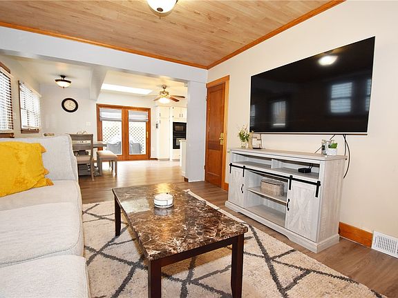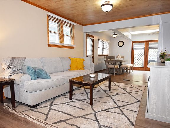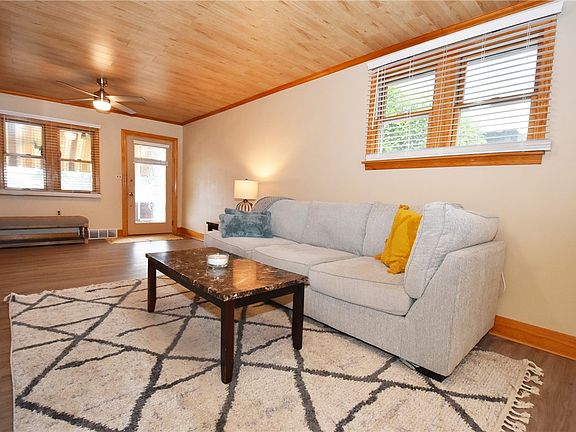 SUPERB LOCATION. The inviting front covered porch welcomes you to this updated home conveniently located minutes to downtown, transportation and shopping. Beautiful leaded from door. Updated throughout with tremendous living space. Large living room with newer wood laminate flooring, first floor bedroom or office with updated half bath. Open, eat-in-kitchen with superb natural light from the skylights, island, a great work space for preparing meals, updated appliances, beautiful subway tile backsplash, atrium door leading to the outdoor space, two-tiered patio, fenced in yard, new retaining wall and cement walkways. First floor laundry plus full bath. Second floor features 2 ample sized bedrooms each with double wide closets. Tremendous finished gameroom, neutral fresh paint, new wood laminate flooring, full bath and extra rooms for storage or workout areas plus access to the off-street parking space. Updated furnace and A/C. Truly move in and ready for you to call HOME!