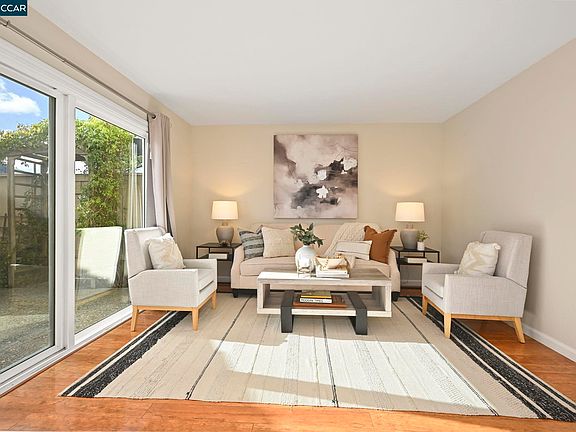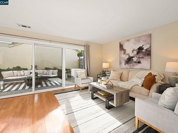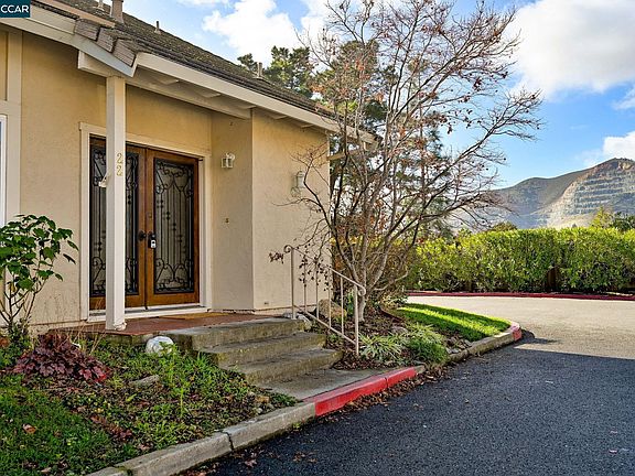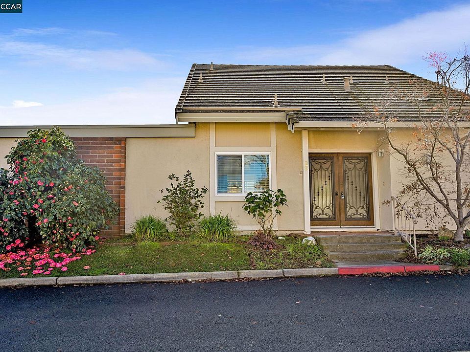 Tucked away at the rear of the complex with Mount Diablo views and sparkles like new. Beautiful entry doors with windows to let in the summer breeze. Remodeled kitchen with new cabinets, pantry, quartz counters & a new stove. Freshly painted interior & re- finished ceilings. Spacious living room with large windows creating lots of natural light. Dine in the formal dining area or breakfast nook. Easy care laminate flooring flows throughout the main living areas. Modern, updated bathrooms and the primary bathroom has heated tile floors. 1 bedroom located on the main level, makes a perfect guest room or office. The primary bedroom has a large closet, plus built in cabinets, and plantation shutters. Don't miss the Mount Diablo views from the second bedroom. Spacious 2 car garage with tons of storage, work bench and laundry area - washer & dryer included. Enjoy the community pool with spectacular hillside views, nearby trails and downtown area with restaurants, coffee shops, park, library and more. Note HOA includes water! A must see.