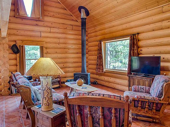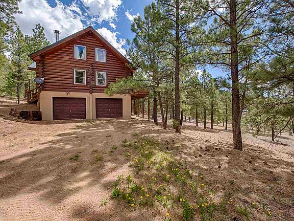 This Swedish cope log home in the woods is the perfect mountain getaway. Located in Loggers Ridge, just outside of Angel Fire, this development provides a very peaceful and private setting exclusive to log homes. This home sits on a gently sloping, 1.03 acre lot that opens up to stunning southern mountain views. The owner's pride is obvious and the logs still glisten in the sun. Inside you'll find a smart layout with a spacious great room with log walls, tongue and groove wood ceilings and saltillo tile floors that add a touch of New Mexico flair. A wood burning stove, dining area and the beautiful kitchen island with painted doors and granite countertop keeps the great room cozy, functional and stylish. A large deck is off the back of the house that's ideal for soaking up the sun and the views! The two guest bedrooms and full bath are also on the first floor with the upstairs containing a loft and master bedroom with ensuite bath and private deck. The home also has a 3 car garage, large utility room and comes fully furnished.