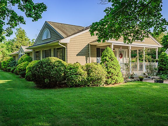 Strongs Neck Ranch. Soaring Cathedral Ceilings, Spacious Living room with Andersen Sliders to deck, 5 Skylights, 2 story wood burning Fireplace, Quartz Countertops, SS Appliances, Lots of Natural light, beautiful hardwood floors through out, Laundry on the first level. Finished basement with OSE. Large deck, oversized det 2 garage with attached car port, fenced yard, close to beach. Private beach & boat mooring w/association fee.