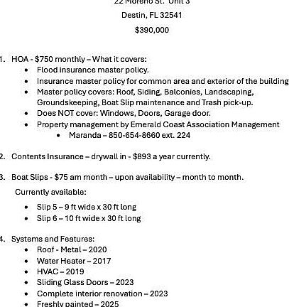 **UNDER APPRAISED VALUE for QUICK SALE** ***BOATERS & BEACHCOMBERS*** Laguna Point is a Destin Harbor Front complex of 16 units with BOAT SLIPS for rent at $75 monthly. If its the beach you want, just a block away is DEEDED BEACH ACCESS to the prettiest beach you've ever seen! COMPLETELY RENOVATED in 2023- including NEW SLIDING GLASS DOORS, FRESHLY PAINTED 12/24, NEW ROOF in 2020, A large garage with plenty of storage + washer/dryer hook-up on the 1st floor with an additional assigned parking spot just outside the front door. The living / dining / kitchen / half-bath are all on the 2nd floor. On the 3rd floor are 2 bedrooms / 2 baths each with a walk-in closet. Unit comes furnished and SHORT TERM RENTALS ALLOWED!!