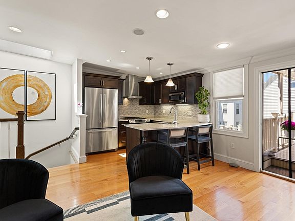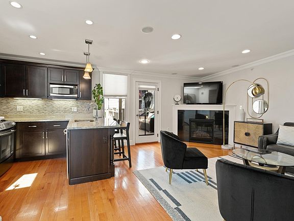 Exceptionally sunny highly desirable penthouse located in historic Charlestown on quiet Mystic Street. 3-Unit condo conversion in 2011 totally renovated. Open living/dining floor plan w/ gas fireplace, recessed lighting, wired for surround sound, crown molding, hardwood oak floors, skylight, central A/C, coat closet, & laundry in-Unit. Beautiful kitchen w/ espresso cabinets, glass tile back splash, granite counters, breakfast bar & pendant lighting. Direct access to 2-tiered deck with neighborhood views. Generous bedroom w/huge double closet & additional free-standing closet. Beautiful white tiled & marble bath with jetted soaking tub. New refrigerator 2021, disposal 2024, hot water heater 2024, common hallway stair carpet 2024. Freshen interior paint 2024. Add ‘l deeded secure basement storage. Area amenities include public transportation, shops, restaurants, Whole Foods Market, & Bunker Hill Community College. Pet friendly, 100% owner, low condo fee and Real Estate Taxes.