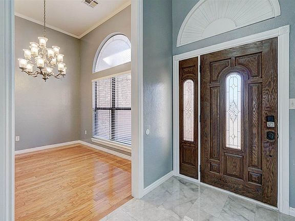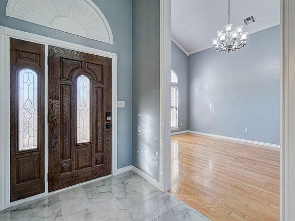 Welcome to this exceptional 4-bedroom, 2.5-bathroom home situated on a sprawling lot designed to impress! From the moment you arrive, the circular driveway and manicured landscaping, highlighted by attractive bushes, create an inviting first impression. A second driveway leads to the back of the home, where a spacious three-car garage provides ample room for oversized vehicles. Step inside to discover expansive ceilings and stunning features, including a cathedral-style ceiling in one of the two living areas. The entryway boasts brand-new tile flooring, while the living and dining areas are adorned with rich hardwood floors. The large kitchen is a chef’s dream, offering an island, abundant counter space with brand-new granite countertops, sleek stainless steel cabinetry, and a smart refrigerator. The luxurious primary bedroom is a true retreat with hard surface flooring, a cathedral-style ceiling, and an en suite bathroom featuring his-and-her sinks, a separate vanity area, and a freshly installed oversized shower with dual showerheads. The bright, clean tile flooring and two spacious closets, including one incredibly large primary closet, complete this serene space. Three additional bedrooms, all with hardwood flooring, tray ceilings, and large closets, provide comfort and style. The home also features a freshly painted interior, a spacious laundry room with ample cabinetry and a sink, and versatile outdoor spaces. Enjoy the covered porch, open patio, and a backyard complete with a storage shed—all perfect for entertaining or relaxing. With abundant parking and space to accommodate all your needs, this home is a rare gem. Call the Wright Team today to set up a private tour at 580-232-4321!