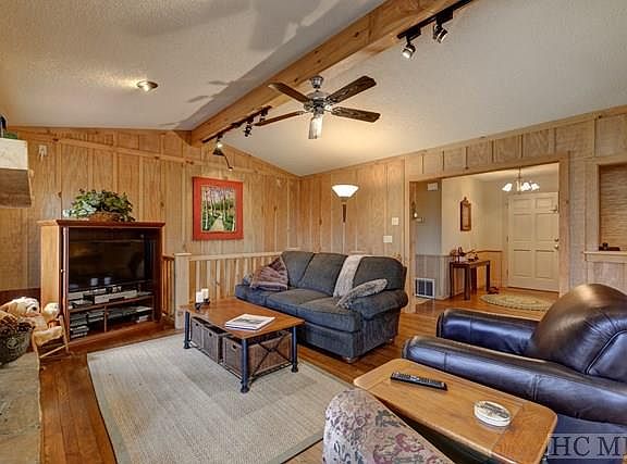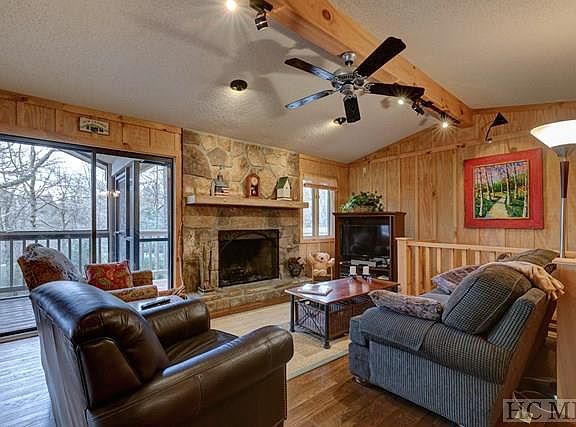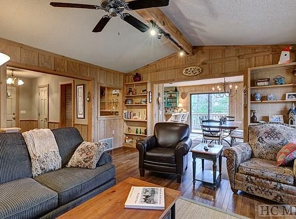 This lovely home sits on a great lot which overlooks the tee boxes on the 4th fairway of Highlands Falls Country Club. In addition to watching the golfers from the screened porch, the wraparound deck off of the dining room has a good mountain view plus a look down the 3rd fairway. The home has been well maintained and was remodeled in 2000. The cozy livingroom with wood floors and wood walls is a great place to relax by the stone fireplace. The large kitchen has tile flooring with a tile work island and breakfast bar, which is perfect when company wants to chat with the cook. Two very large bedrooms with private, tile baths are on this level. If you need more room to spread out while entertaining, a large family room on the terrace level is a great spot to watch football or give the younger set a place to play their video games. This level includes the third bedroom, bath and the one car garage. If you are looking for easy, look no further because this offered fully furnished as well!!