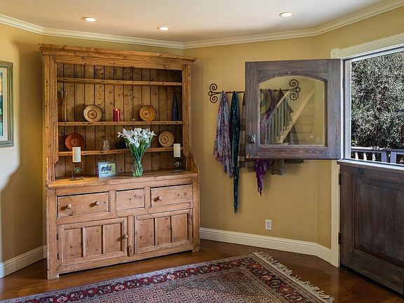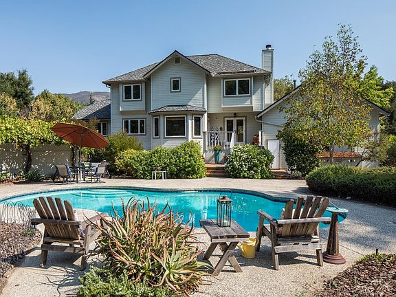 Trails Edge: Sun splashed Carmel Valley prime with brand new roof. Fully-fenced flat-acre plus at the edge of extensive riding trails, this mini-ranch, horse property has it all: pool, riding arena and paddock with stall, shelter, tack room and hay storage; yoga studio; meandering paths; family orchard with Pink Lady apples, cherries, pears, plums, almonds and citrus; raised, irrigated vegetable gardens with flourishing zucchini, kale, chard, tomatoes. Two story, 4 bedroom (2 currently used as offices), 2.5 baths, gleaming variable-width barn hardwood floors, eat-in kitchen with pull-out pantry, 6-burner gas range, Jenn Air fridge, formal dining, inviting living room with French doors to gardens and awesome mountain views, family room, wine room, delightful & airy master bedroom & bath with classic claw-foot tub. Ride your horse directly onto nearby trails, enjoy the rich ambiance of Garland Park and return home to the ideal Carmel Valley life.