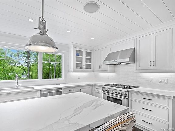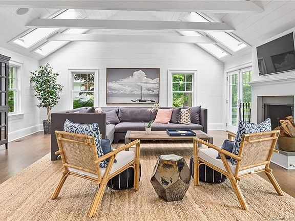 WATERFRONT COLONIAL IN OLD HILL. Spectacular custom renovation of ~4,000 square feet across three finished levels on a coveted Westport street. Accented with crisp shiplap, and extensive windows, the heart of the home is a stunning kitchen that flows to the family room with vaulted ceilings, fireplace, and french doors to the deck. The dining room and formal living rooms offer captivating, bird's eye views of the pond and property. An office with custom built ins and dry bar complete the main living area. 4 bedrooms upstairs including a master suite with fireplace, walk-in closet and sleek bath with rain shower and radiant heat. 2 bedrooms, each with window seats and custom closets are joined by a jack and jill bath with oversized tub as well as a third bedroom with ensuite bath. The light-filled walk out lower level offers a large playroom that flows to the lower deck, a full bath, a gym area (option for a 5th bedroom) & an oversized mudroom off of the 2 car garage. Nash's Pond is an idyllic, private, fresh-water pond encircled by 26 homes. Paddle board from your own dock before breakfast. Fish from your canoe in the evening. Ice skate in the winter. Close to town, train, schools, and beach. No flood insurance.