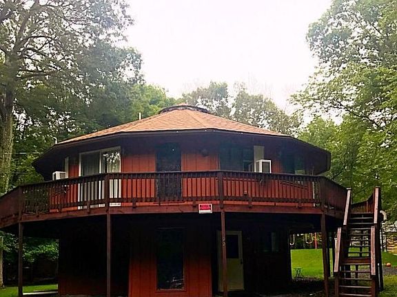 WOW! Do you like to be different? Then you have to take a look at this! ''THE ROUND HOUSE'' features 3 bedrooms, 2 of which offer direct access to deck, beautiful living and dining room with hardwood floors, 2 full bathrooms, an over sized lower level family room with larger master, 2 full baths, round wrap around deck, large backyard and a private heated game room off of house with pool table, air hockey and darts (included). Enjoyed as a second home and a vacation rental income generating property. This home comes fully furnished! Turn the key and move right in or start renting immediately for some extra income. Community features 5 lakes, 2 pools, playground, basketball courts, club house and 24/7 security. This home is worth a trip to the Poconos!