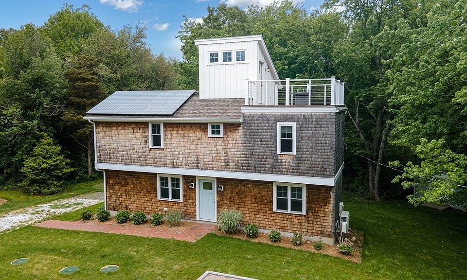 Custom designed 2 bedroom, 1.5 bath home in meticulous condition! Situated on a very private 2 acre lot, this highly efficient home offers a new eat-in kitchen, 1st floor den & 1/2 bath, 2 spacious bedrooms with laundry and full bath on the second level, and a walk-up roof deck to enjoy sunrise or sunset! A roof top solar array offers high efficiency heating and cooling throughout the year. A custom shed allows for extra storage. Conveniently located minutes from area beaches, conservation areas, and other Little Compton offerings!