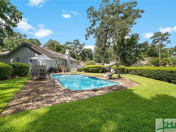 Private retreat in the city! Enjoy your beautifully landscaped garden and pool with a slide, perfect for warm summer days. This low country home features three bedrooms and 2.5 baths. The master suite with vaulted ceilings is generous in size and light. Master bath includes double vanities and a jetted tub. The spacious family room has wide-plank hardwood floors, vaulted ceilings, and stunning brick fireplace. Kitchen with a breakfast area, formal dining room. 2 car garage. Property is in an X flood zone, no flood insurance required. This sanctuary is what you have been looking for!