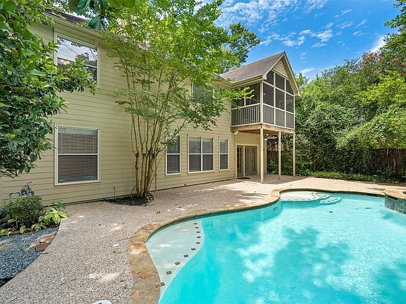 Beautiful updated two story home located in The Woodlands Village of Alden Bridge. Great location across from the park, walking distance to Buckalew Elementary and close to dining, shopping, schools, parks, medical, and all of the amenities The Woodlands has to offer. Beautifully landscaped yard. The first floor features hardwood flooring, formal dining room, formal living room, large family room w/ fireplace, breakfast room, and island kitchen w/ stainless & black appliances open to family room. The upstairs features a large master bedroom with sitting area, fireplace, & private screened in porch overlooking the pool, three generous sized secondary bedrooms & bathroom, and game room. Huge backyard w/ sparkling swimming pool & spa and lots of mature landscaping for privacy! Two car attached garage. Kitchen refrigerator, washer, dryer and pool maintenance included. A must see. Schedule your showing today!