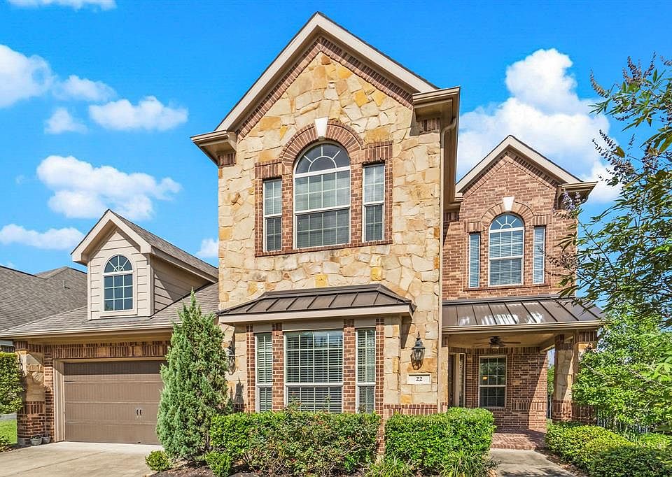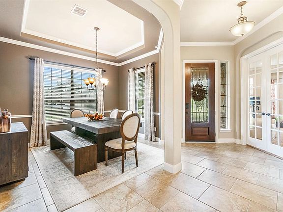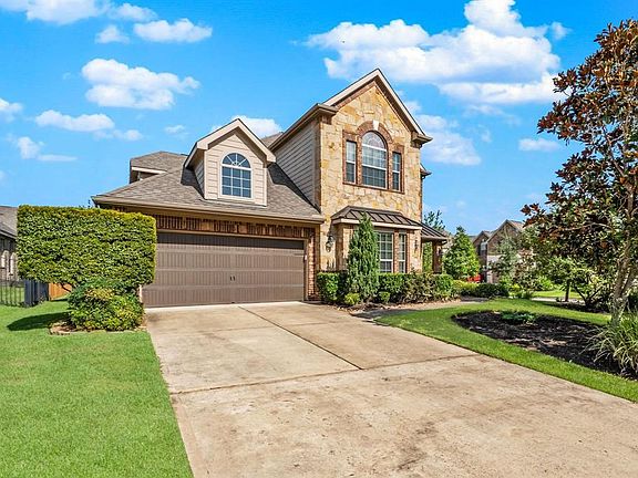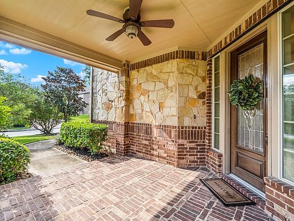 Fabulous Village Builders home. Spacious rooms! Open Floor Plan! Crown molding! Arched openings and art niches! Adorable front porch with fan. Huge office with French doors. Dining room with chair rail and tray ceiling. Kitchen has large island with breakfast bar seating, pendant lights, SS appliances, travertine back splash, under cabinet lights, and walk-in pantry. Sunny breakfast room. Den has vaulted ceiling, wall of windows, surround sound, cast stone gas log fireplace, recessed nook for shelving/electronics. Master with window seat, tray ceiling and en-suite bath with dual sinks, jetted tub, framed mirror, huge shower and private commode. Huge walk-in closet with 3 hanging areas and closet. Up the winding staircase with iron balusters, you will find a cozy study nook, a game or media room with surround sountd and 3 bedrooms sharing 2 baths (one private, one Hollywood). Lovely covered back porch with surround sound. See first photo caption for a link to video walk-through of home!