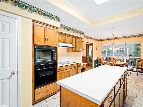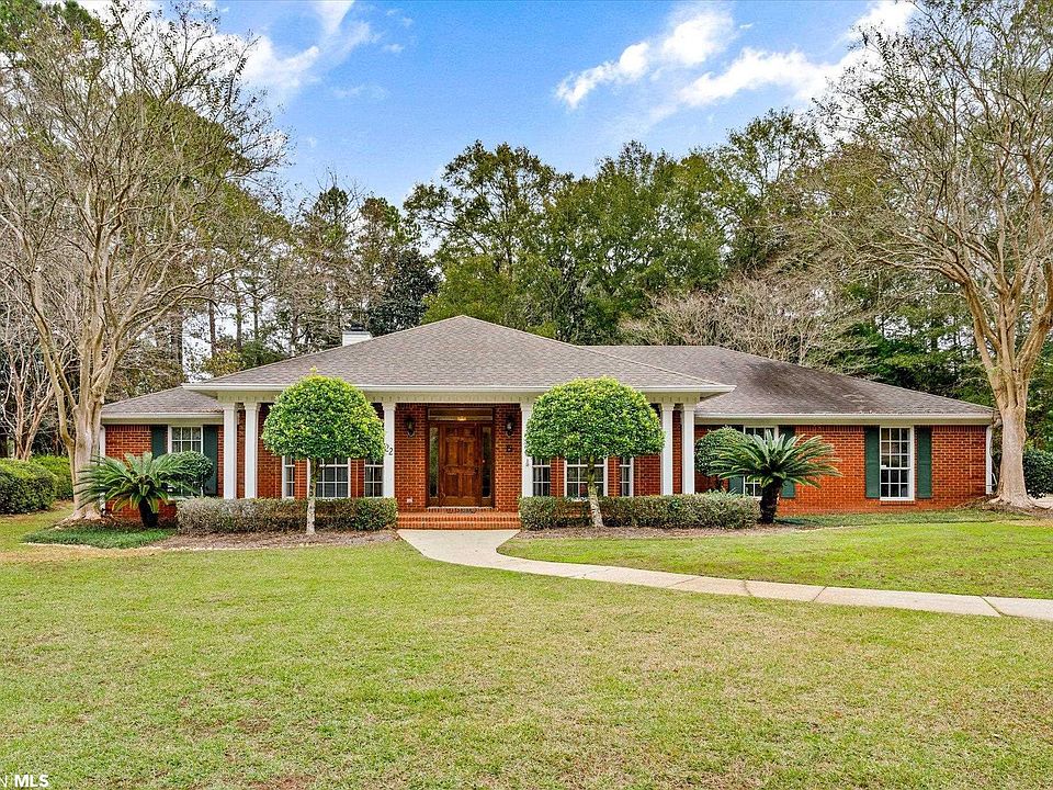 Perfect location in Old Daphne, walking distance to Bayside, Christ the King and Daphne Elementary North. The home sits in a private cul de sac in St Charles PL Subdivision on one of the largest lots in the subdivision at almost 3/4 of an acre. There is plenty of room for a workshop or an in law suite to be built on the lot. This home has lots of character with brick accent around a gas fireplace in the living room and vaulted ceilings with wooden beams. The kitchen has a breakfast area with an island and plenty of cabinets for storage as well as a pantry and a built in desk. The home has a split floorplan with a primary suite featuring turtle back ceilings, a large walk in closet with built ins. The primary bath has a jacuzzi tub, walk in shower and two vanities. The formal dining room has a beautiful bay window with a beautiful view of the front yard. Walking through the spacious sunroom takes you to the large, private back yard which is partially fenced. The home has gutters, central vac and alarm system in place. The laundry room is off of the garage entrance and has a sink and a washer and dryer that will convey. The attached 2 car garage has sealed floors. This gorgeous property is beautifully landscaped and close to Lott Park and the bay to watch lovely sunsets.