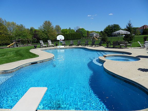 Stylish Brick Front Estate Home with Circle & Transom Topped Windows on One Landscaped Acre. A Grand Two Story Foyer with Hardwood Flooring, Turned Staircase & Sundrenched Palladian window is a great place to greet your guests. Formal Living & Dining Rooms join the Entrance featuring Elegant crown moldings, chair rail and bump-out window detail. Directly behind is a Breathtaking view of the Family Room boasting Dramatic Stone Fireplace & Coffered Ceiling. Spacious Gourmet Kitchen with Center Island, Double Oven, designer Tile backsplash, Built-in Pantry and Desk areas is also Open & Bright. Convenient first floor Office. Full Finished Walkout Basement is an Entertainers Delight! Relax upstairs in the Sumptuous Master retreat featuring Sitting Room, tray ceiling & Lavish private bath w/ jetted tub. 3 Additional Bedrooms including a princess suite w/ second full bath. For outdoor enjoyment; a rear deck which overlooks the expanded paver patio, Firepit area & Sparkling free form inground Pool. New Roof. WOW!