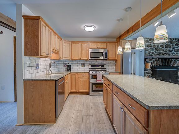 Gas fireplaceFieldstone wood-burning fireplaceRoomy islandStainless steel appliancesOversized storage closetNew cabinetsGranite counters