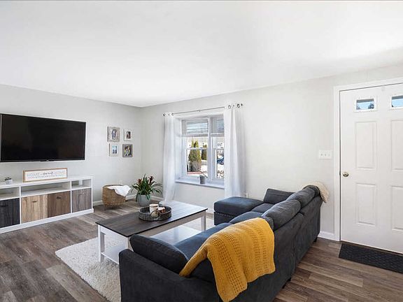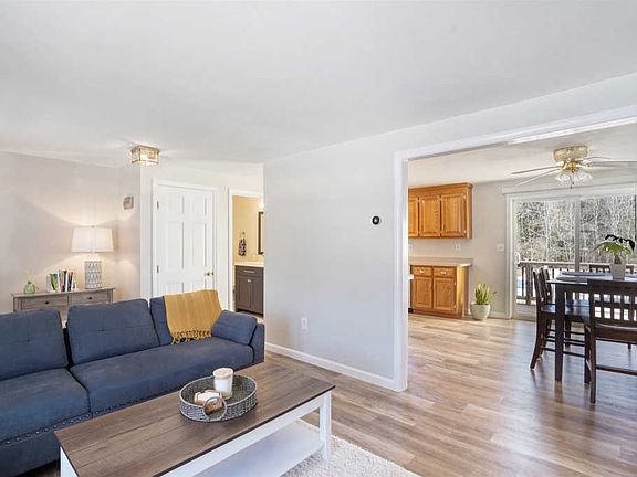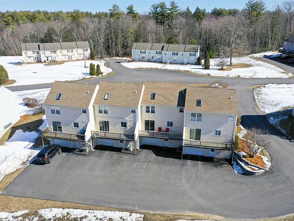 Welcome to Sandown! Pine Acres is a desirable, quiet townhouse community, nestled among nearly forty acres of woodlands. This spacious open-concept home is filled with natural light and boasts many attractive features, including fresh paint and new flooring throughout the entire first floor. The dine-in kitchen has plenty of counter space and cabinet storage with a slider that leads directly out onto a private balcony overlooking the grassy and wooded landscape. The first floor bath has been updated with stylish flooring and vanity. Upstairs you'll find newer carpeting and two sizeable bedrooms with plenty of closet storage. The master bedroom has vaulted ceiling and skylight, double closets, and direct access to the full bathroom. There is also a pull-down staircase for attic access for additional storage. The basement features a garage and separate entry area with laundry, home also has central A/C. The community is pet friendly and has a swing set for everyone's enjoyment. The monthly fee includes water, septic, snow removal, and landscaping. Welcome HOME! Showings by appointment begin Saturday 3/13. Agents are related to the seller.