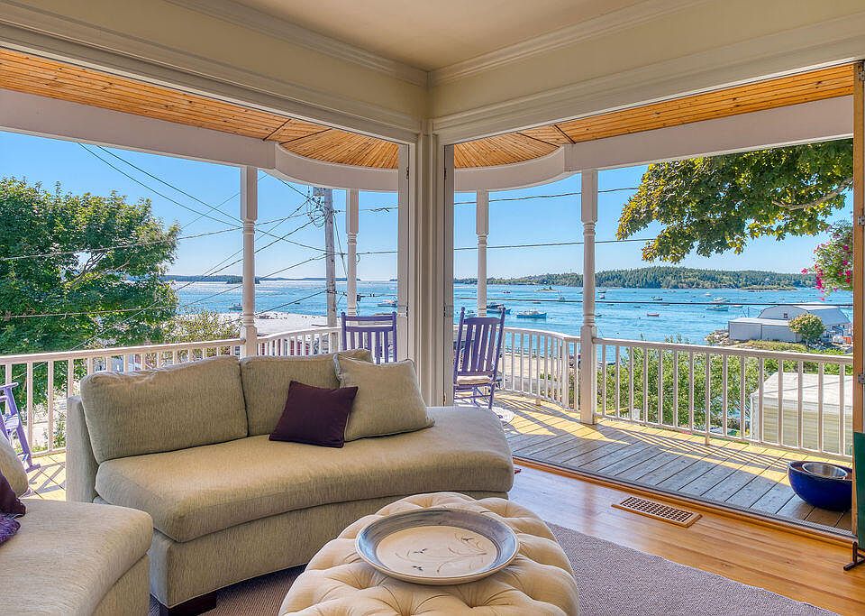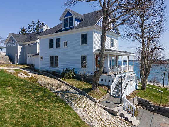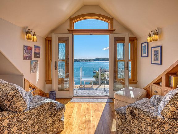 Experience the ultimate in coastal living with this magnificent property that boasts stunning views of Stonington Harbor, Deer Isle Thorofare, and the surrounding archipelago. This beautifully renovated Victorian masterpiece features exquisite craftsmanship and meticulous attention to detail. The living room is a breathtaking space with two walls of accordion windows that provide uninterrupted views and open-air sitting during the summer, while a Deer Isle Granite surround fireplace and wood-burning fireplace insert make it a cozy retreat in the winter. The gourmet kitchen is a chef's dream, complete with a custom Aga Range, cherry cabinetry, a marble-topped island and granite countertops. Upstairs, the ocean-facing bedrooms, home office, and spa-like bathroom with Ming green marble and an open-view soaking tub provide the perfect escape. The primary suite is a masterpiece of design, with stunning cherry woodwork that is reminiscent of sailing yacht built-ins. The 3rd floor retreat is a private sanctuary with a coffee/wine bar, fridge, dressing room, and private balcony with 200° views. The newly constructed Rockport Post and Beam carriage house is the perfect place to entertain guests, with a 3rd fireplace, 2nd Aga Range, and secluded covered porch. The first floor is a well-equipped workshop, making this property a dream for those who work from home. With professional tech wiring, internet, stereo, and cell-phone coverage, this home has it all. This is a rare opportunity to own an elevated in-town site with breathtaking views, and it's the perfect place to call home.