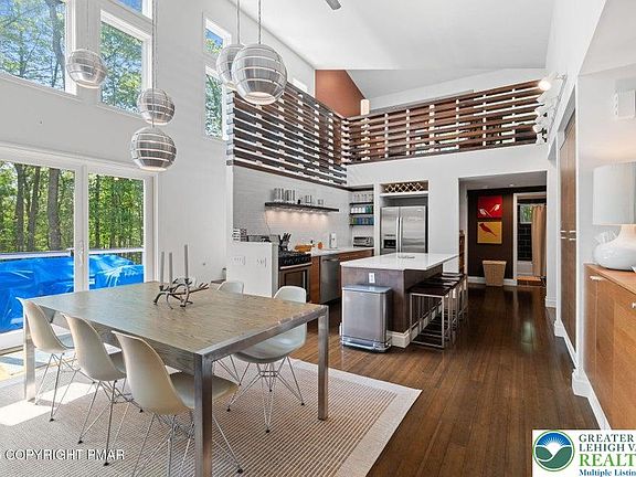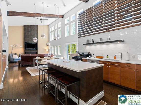 Elite custom-built 3 bed/2 bath Mountain Modern home with gorgeous open concept great room, central AC, forced air heat, & flowing contemporary design for sale in Pleasant Valley West! New HVAC system installed in 2024! Located on a cul-de-sac-accessed private 1.26 acre lot, this home is sure to impress with the striking vaulted ceilings, floor-to-ceiling fireplace, bamboo floors & high end finish! The gourmet kitchen features quartz countertops, stainless steel appliances, & breakfast bar seating! Unwind in the open dining area with striking views through the wall of windows into the wooded surroundings! Spacious main floor primary suite with double vanity, separate shower stall, soaking tub, & toilet closet. 2 additional bedrooms & full bathroom on the main floor. The oversized loft is perfect as a second living area or family room, with enough space for everyone! Relax on the rear deck (refreshed with Trex decking 2023) or second story loft balcony! French drain installed on the north side of property 2024! Be sure to enjoy Pleasant Valley West's lake & beach! Minutes from hiking, biking, rafting, downtown Jim Thorpe, Hickory Run State Park, & more! Great commuter location to PA-476 & I-80! See today!