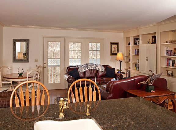 Stylish and sunny, this tri-level two bedroom, three and a half bath townhome offers many upgrades such as granite, rope crown moldings, built-in bookshelves, parquet floors, aged brass cabinet hardware, and updated baths. The eat-in kitchen features dark granite counters with wide space for food prep, dining or entertaining. Balcony offers privacy and wooded views. A finished lower level includes family room, den, laundry and full bath.