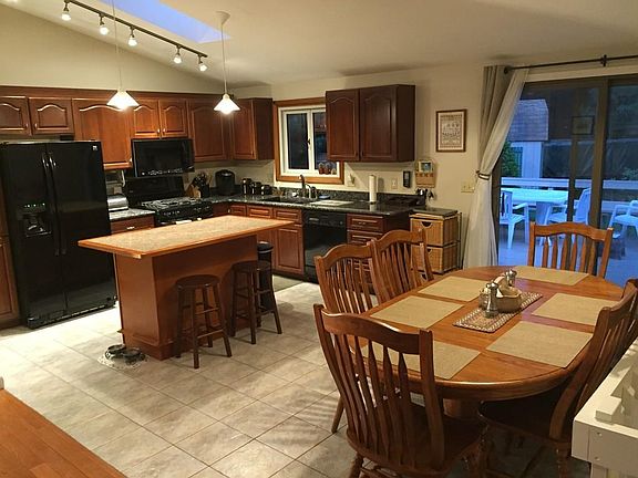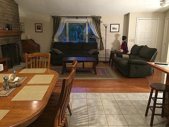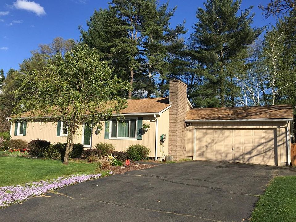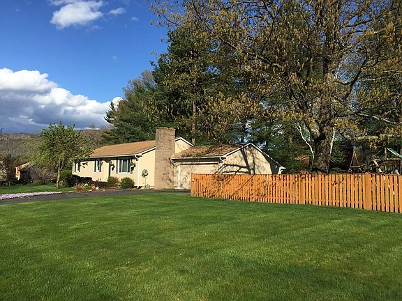 Attractive ranch home with open-concept living area located in established neighborhood. Living room with hardwood floors, fireplace and cathedral ceiling open to large eat-in kitchen with sliders to deck. Kitchen is updated with beautiful cherry cabinets and granite counters. Three bedrooms including large master bedroom with private half bath. Basement is totally finished with access to full bathroom and laundry room offering additional space. Corner fenced lot, shed and lovely mountain views.