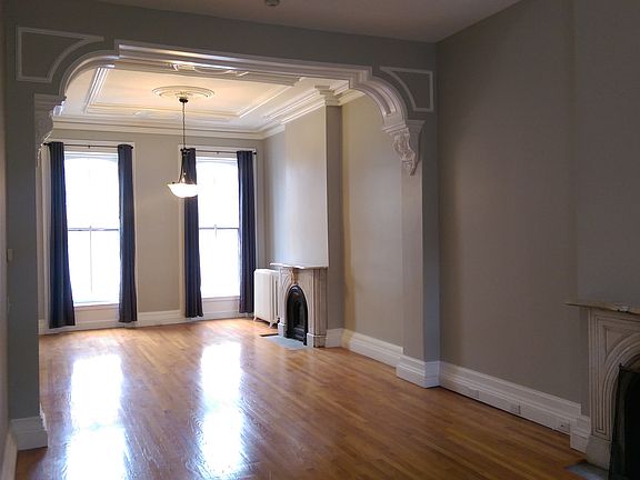 A three bedroom apartment with two and a half bathrooms is offered for rent in a beautiful brownstone in downtown Albany. One of the bedrooms includes an adjoining office nook. Features include a den, large living and dining area with fireplaces, a kitchen with granite counter-top and stainless steel appliances, a large pantry, a back deck with a beautifully landscaped fenced courtyard. The apartment includes on-demand hot water, a washer and dryer and a two car parking space. Rent is $2,400 per month and the tenant pays utilities (heat and electricity). Water, sewer and trash is paid by the landlord. One month security due at lease signing. Owner pays water, sewer, trash, and snow removal. Tenant pays gas and electric. One year lease. Cats are okay. Security deposit due at signing.