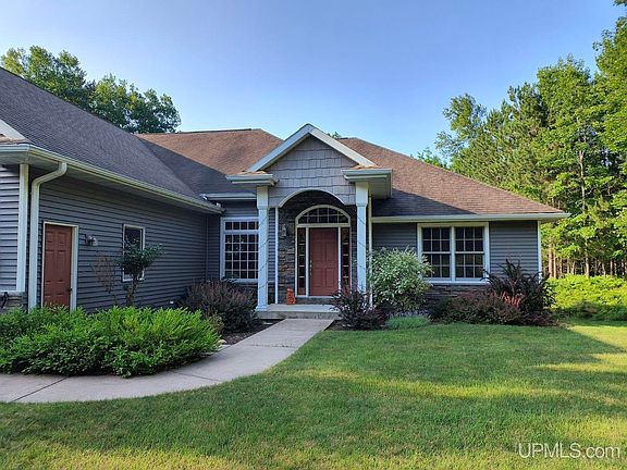 Get ready to be wowed! This beautiful custom home with main floor living is just 5 miles from downtown Marquette. Situated on 5 acres and boasting plentiful space with an attached 3-car heated garage and a 30x44 detached garage, this home has tons of appeal for every member of your family. Open the front door to 10 ft ceilings and natural light in this 3 bedroom/3 bath home with custom features throughout and a full walkout basement. The living room features an 11 ft tray ceiling, gas fireplace, transom windows and a triple French door that invites southern light. Step out to the Trex deck with its cedar vaulted ceiling and private year round views. At the heart of this home are 9 ft kitchen and dining ceilings, warm cherry floors, custom cherry and birdseye cabinets, stainless appliances, prep sink and granite island making it the perfect space to entertain. Just off the kitchen, the laundry room with utility sink is conveniently connected to the heated 3 car garage. Bringing groceries inside couldn't be easier. A rare find with all bedrooms on the main floor and a layout that provides privacy to each. The primary suite was uniquely designed for ultimate quiet. Generous sized bedroom, walk in closet with built-ins, and full bath with a soaking tub and glass walk-in shower with body jets. Two more bedrooms are on the opposite side of the home with another full bath. Need more room? You'll love the full walkout basement with 9 ft ceilings, sliding glass door, huge windows, family room, full bath and bar/kitchenette area. With its private patio entrance this walkout space could easily be used as a conforming 4th bedroom or Airbnb. The crown jewel might just be outside...a 30x44 detached garage with 12 ft doors and concrete floor to store your boat, camper, tractor or extra vehicles. The house and attached garage have radiant in-floor heat and K2 insulation throughout to keep you and your toes toasty warm. Heat solely with propane gas or, if you wish, supplement with the energy efficient outdoor woodstove. Planned for easy maintenance, the landscaped yard has an in-ground sprinkler system and perennial shrubs leaving you free to enjoy your summer. If gardening is your passion, there's plenty of space to expand. Relax on the deck or patio, or grab your fishing pole and hike down your backyard hill to Silver Creek where that big one is waiting to be caught!
