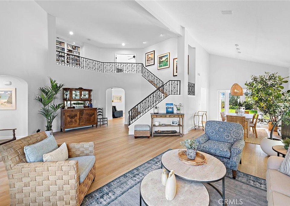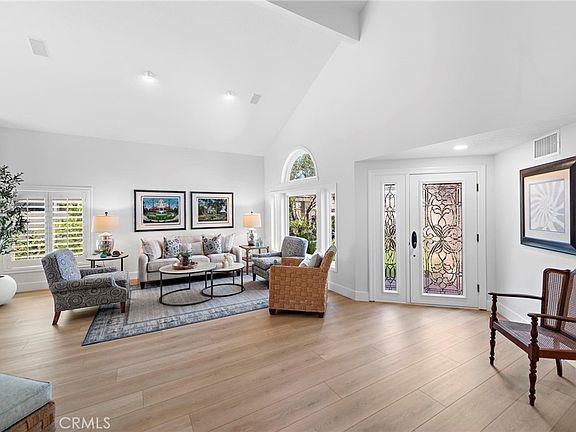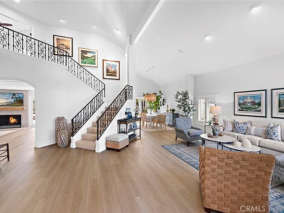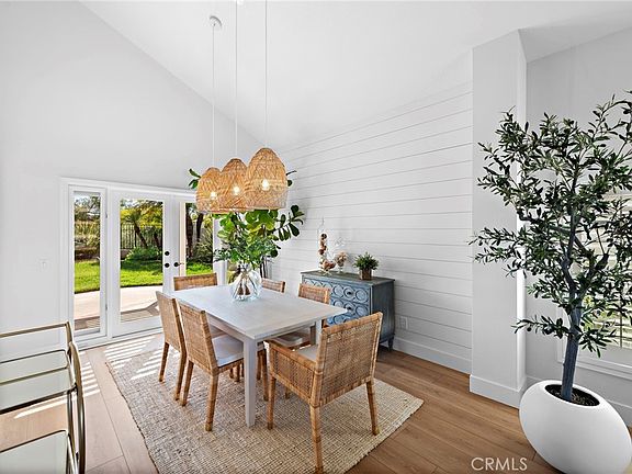 Step into coastal elegance with a modern twist in this stunning Palisades, Laguna Heights home. With coveted southern exposure and stunning views of the surrounding hills, including a peek of the ocean, this residence embodies relaxed refinement, offering a soothing interior and comfortable living spaces. Remodeled just 13 months ago, this home boasts brand-new LVP plank flooring throughout most of the home, a sleek modern kitchen equipped with a center island, top-of-the-line appliances, and charming shiplap detail in the formal dining room, complemented by Serena & Lily light fixtures. The main floor bedroom is complemented by a beautifully remodeled bathroom with a walk-in shower. Upgrades abound with Milgard dual-pane windows, custom blinds, PEX piping, and a newer HVAC system. Upstairs, the primary suite is a serene retreat, boasting separate his and her closets and French doors that lead out to a rebuilt deck furnished with composite deck boards. Indulge in a remodeled bathroom with a dual sink vanity, soaking tub, and walk-in shower. The upstairs guest bedrooms share a modern coastal-style bathroom. All closets have been equipped with professional organizers for optimal organization. The expansive rear yard, boasting views of the surrounding hills, features a built-in BBQ, a covered patio, and ample space for a pool should you opt to install one. The Palisades community is known for its generous lots, low HOA dues, wide streets, and top-tier schools. Residents enjoy easy access to two community pocket parks, hiking, and biking trails within the nearby 16.5-acre Chapparosa Park, which provides a direct trail to Salt Creek Beach