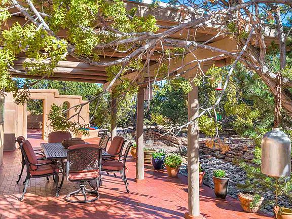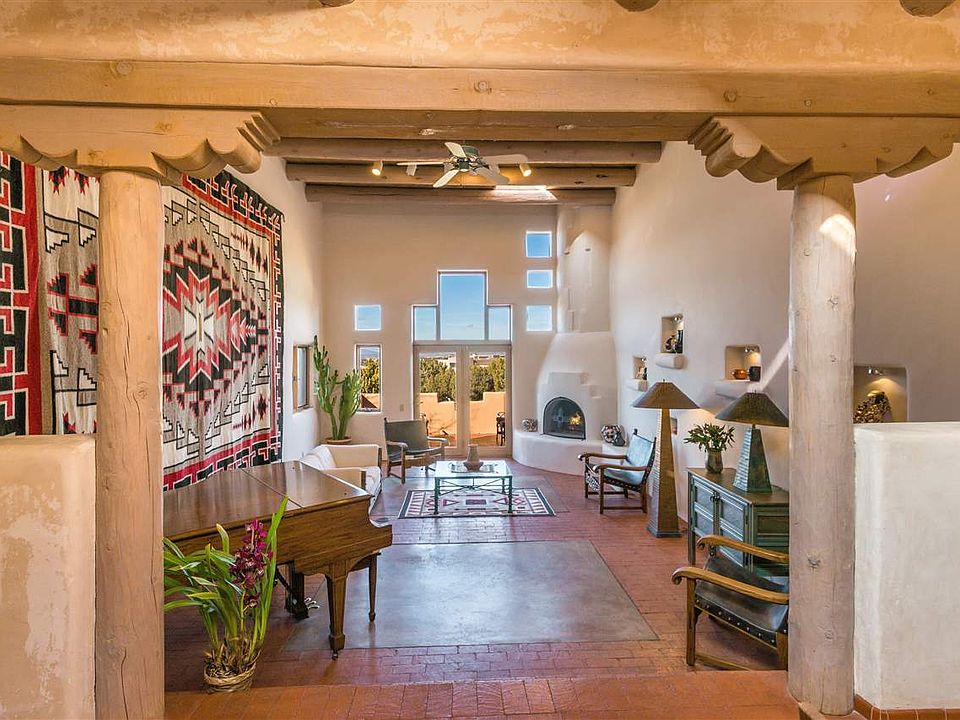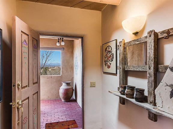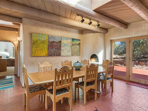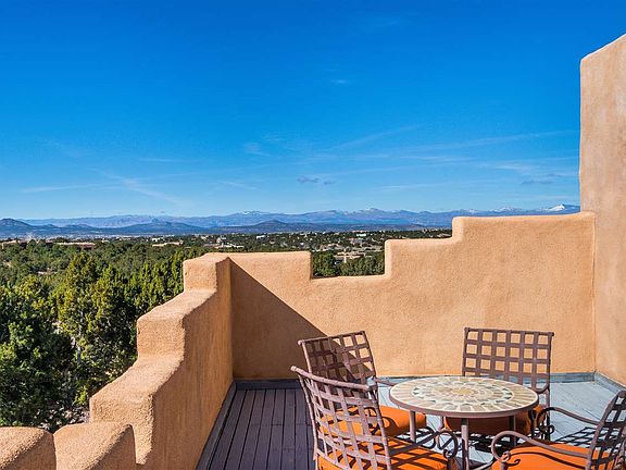 Hello easy, comfortable, genuine Santa Fe Adobe house, with so much to offer! It has everything! Enough rooms for a lot of family to come at once! Lots of togetherness and laughing, and still plentiful privacy! And fabulous views!...of distant mountain ranges; overwhelming, big blue skies and cloud shows; smashing sunsets so outrageous they look fake! Space and privacy on 2.5 acres...see no one in your view, and no one looking in. Santa Fe style details like hard towel plaster, viga ceilings, lit nichos, 5 Kiva fireplaces, and REAL Adobe construction! - handmade Adobe bricks exactly like the Native Americans made thousands of years ago! The house has large rooms with high, finished ceilings, classic brick floors ( with cozy radiant heat ) and AC. Most rooms have access to outdoor spaces for entertaining, or quite enjoyment. There are gorgeous, established, perennial gardens of various roses, freewheeling Maximilian daisies, and lush lavender, on a lushly wooded lot, giving the property the feel of a country vacation yet only a ten minute ride from the Palace of the Governors on the Historic Santa Fe Plaza! Move right in, or use this as a canvas to update to your dream house! Owners moving to be near some of their twenty two grandchildren, hence the insane price!