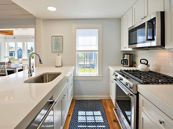 Ocean views of the Nantucket Sound plus steps away to a private sandy beach with deeded rights, this charming one bedroom, one bath unit was totally renovated in 2019 and in 2022 a new energy-efficient heating system & on-demand hot water system was installed. Kitchen offers white quartz countertops and stainless steel appliances including a gas range, refrigerator, dishwasher, and microwave. Also included is a full-size front-loader washer and dryer. Living room has a cathedral ceiling w/ ceiling fan & skylight and is open to the dining area / sunroom with wide pine flooring throughout & all with ocean views. Enjoy your morning coffee on your brick patio with all the sun & ocean breezes you have been dreaming of. Nearby is our Popponesset Marketplace where there is something the whole family can enjoy, whether it be the many boutiques, ice cream shop, mini golf, or the award-winning Raw Bar and much more, you will never want to leave. This unit is being offered fully furnished and has a great rental history. Call for further details.