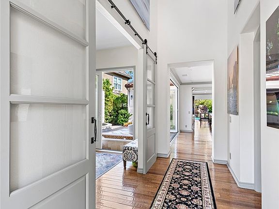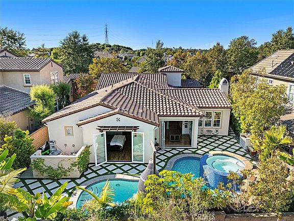 Offering the preferred style and ease of living that accompanies a large SINGLE-STORY Floor plan this highly upgraded Ladera Ranch home is ready to enrich your lifestyle. Set within the exclusive Amarante neighborhood in guard-gated Covenant Hills, the luxurious residence impresses at first sight with handsome Spanish architecture, picture-perfect landscaping and custom hardscaping. A towering entry proudly introduces an open and bright living environment that includes three ensuite bedrooms and three- and one-half baths in approximately 2,750 square feet. Formal living and dining rooms open via glass doors to a courtyard with two custom fountains, creating a private place for elegant entertaining. The family room also opens to the courtyard and displays a fireplace with custom mantle. The kitchen is breathtaking, complete with an island with bar seating, quartz countertops, a custom tile backsplash, white cabinetry, deluxe stainless steel appliances, and a fabulous breakfast room with glass accordion doors sliding away to the backyard. A rotunda vestibule leads to a primary suite that hosts backyard access, a paneled accent wall, tray ceiling, leaded-glass windows over a soaking tub, separate vanities and a spacious shower. One secondary bedroom showcases a large arched window, and further embellishments throughout the home include hardwood flooring, crown molding, built-ins, custom closets and an attached two-car garage. Make a splash in the backyard, where a resort pool with rockscape water slide features a raised spa, and a built-in BBQ and large patios with turf-inlaid concrete enhance entertaining. Enjoy access to Covenant Hills’ opulent clubhouse, pool and tennis courts as well as Ladera Ranch’s numerous other pools, club houses and parks. Oso Grande Elementary School, aquatic and skate parks are a short stroll away and shopping centers and trails are close to home. Founders Park is home to a weekly farmers market, Ladera Ranch’s annual Spring Festival, and Fourth of July fireworks.