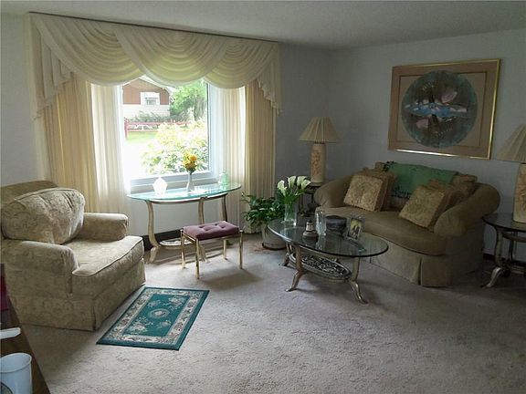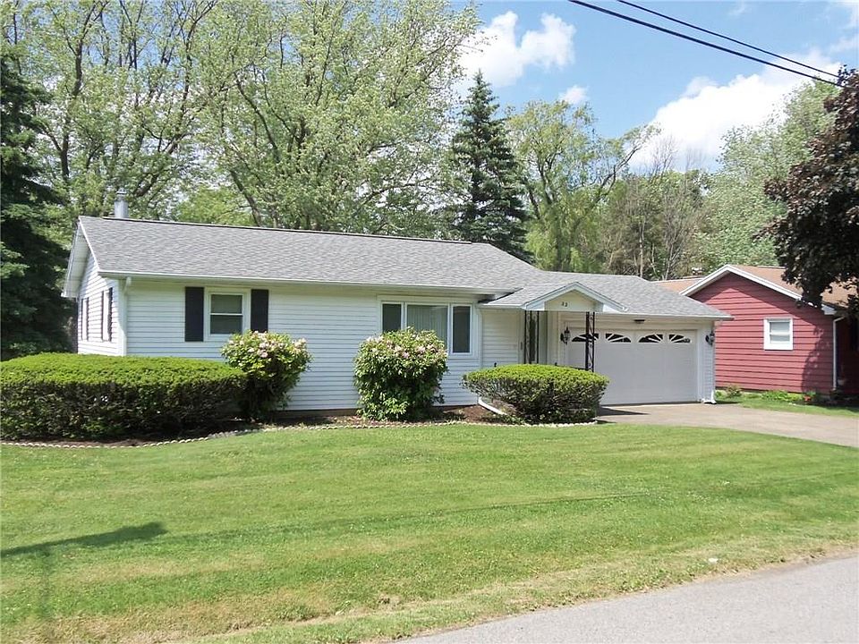The perfect home to scale down to or start out in! Home is one floor with two decent size bedrooms, eat-in kitchen, and sizeable living room. The basement is mostly finished with tiled floor and has a gas fireplace (stove), 1/2 bath, and plenty of add'l closet and storage space. Attached garage has nice enclosed rear patio and a very pleasant back yard with storage shed. Newer FHA furnace and has central air! Newer roof, vinyl siding and windows. Home can be purchased with most all furnishings!
