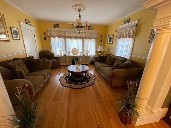 This one of a kind two unit home was built in 1925 by the New Bedford architectural firm on Brown and Poole for Harry Wantman, a New Bedford merchant. . The home offers an unusual combination of design and decorative elements in 20th century 2 family architecture. The front entrance treatment suggests Georgian Revival architecture with a semi-elliptical small porch roof supported by double slender columns. Some of the impressive interior details include coffered ceilings, columned arch room dividers and much more. Both of the oversized 3 bedroom units boast a spacious living room, formal dining room, den, huge galley kitchen and bath. The first level has a heated sun room while the second level has a private deck. There is a two stall garage and first level private deck. This home is in exceptional condition with maintenance free exterior, insulated windows, updated utilities and is ideal for an owner occupy. First showing is at Open House Saturday July 24 from 12-2.