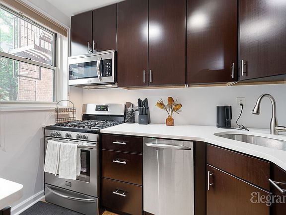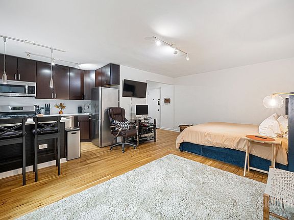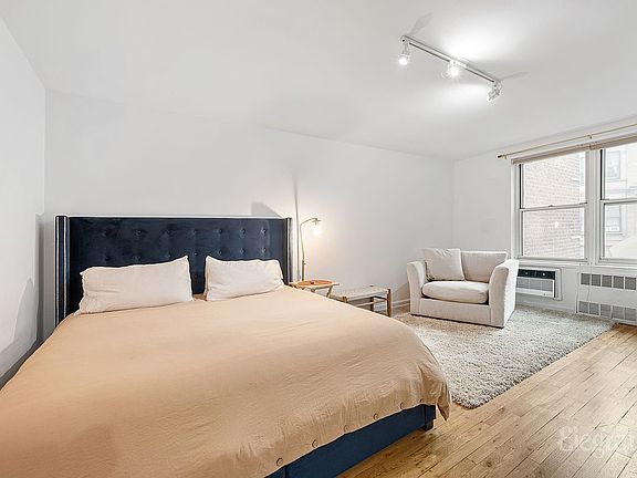 The main room is open plan with the kitchen .. tons of room for entertaining and three large North-facing windows. The windowed kitchen has stainless steel appliances, a stainless bottom-freezer refrigerator and plenty of cabinetry as well as an island/breakfast bar with more storage space and pendant lighting. There is a large side room that can hold a home office plus a separate dressing room leading into a renovated windowed bathroom. Three large closets, a linen closet and a utility closet supply fantastic storage. The ceilings are 9’ throughout and there is an in-wall AC unit.