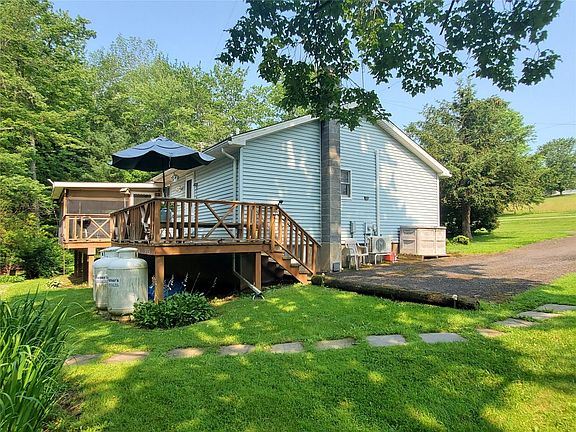 This country gem has 12.38+- mostly wooded acres with a stream. Pleasant country setting with long paved road frontage. Living room with picture window, eat-in kitchen, formal dining room with sliding glass doors to rear screened in porch, laundry room and a family room. 3 bedrooms and 2 full baths. The master bedroom has a walk-in closet and it's own bathroom with a whirlpool tub and a separate stall shower. Full walk out basement with sink and wood heater. Backup generator services a portion of the house. 2 car detached garage. 2 sheds. Includes oil, gas and mineral rights. No signed lease. A real treasure.