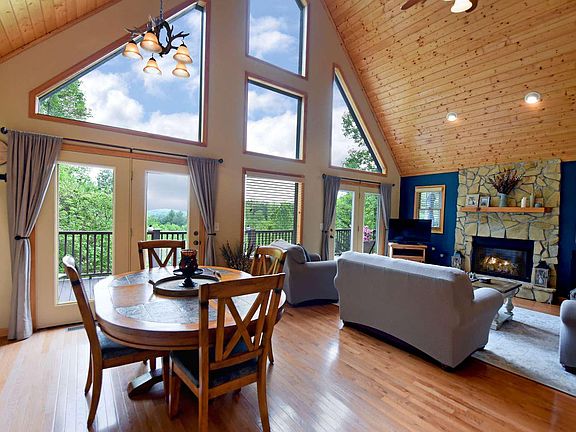 IMPRESSIVE MOUNTAIN VIEW CHALET...This mountain jewel welcomes you with soaring wood ceilings, open floor plan, spectacular fireplace highlighting the relaxed casual ambience. The great room opens to a dining area and invites celebrations along with the well planned kitchen and large island. Main level has guest bedroom, laundry area and full bath. The entire upstairs is designated to the master suite where you can wake up to the views and features a sitting area and in-suite bath. Finished lower level with entertainment area, bedroom,den/office and full bath. Venture outside to the spacious covered decks where you can entertain family and friends. Take a dip in the hot tub and get caught up in the views and nature. Grounds are nicely landscaped. Home comes partially furnished.