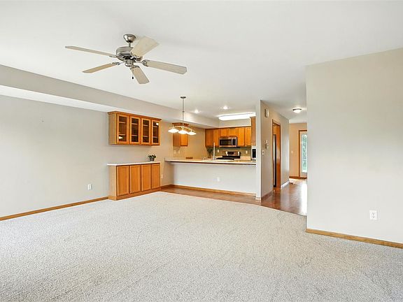 Well-maintained end unit 2-story condo backing to HOA green space in a convenient Iowa City location! The main level features new carpet, a cozy gas fireplace, sliding door out to nicely stained deck, and a spacious kitchen with upgraded appliances, gas range, pull-out cabinet drawers, and breakfast bar. Designated dining area is fit with extra cabinetry, adding even more storage & function. A convenient half bath is located on the main floor for guests. Upstairs you'll find two bedrooms, including a primary suite with an ensuite full bath and walk-in closet. The second full bathroom up, with great storage, serves the spacious second bedroom w/ walk-in closet. Attached 2-car garage enters to the lower level flex space, offering opportunities for a home office, gym, or storage. Laundry closet in the LL. New roof in 2021. All in a great location with easy access to the nearby bus line, walking trails, parks, and I80!