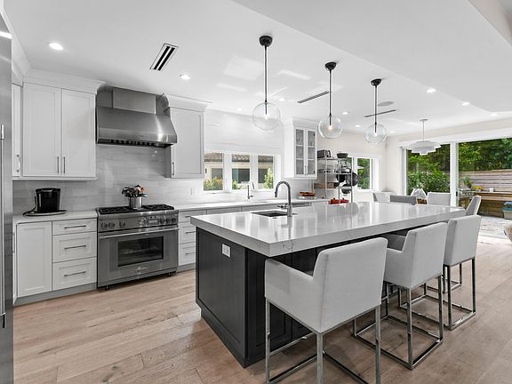 The bathrooms rival a luxury spa experience. The primary suite showcases a grand bath with dual vanities, a soaking tub, and a glass-enclosed shower with striking floor-to-ceiling tilework. Additional baths are equally refined, blending sleek cabinetry, quartz counters, and designer finishes with custom stone and tile details.