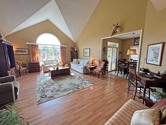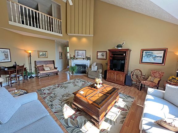 Charming and meticulously maintained home with easy maintenance and close to Harbour Tree's Golf and the Beach Club. Copper Pointe is a wonderful smaller community, nestled in and surrounded by beautiful homes and the lake. Freshly painted exterior, wonderful architecture with vaulted ceilings. Great Room is open and bright with so many windows. Study on the main floor. Updated primary bath on the main floor. 2 bedrooms in the open loft plus 2 HUGE storage rooms on both sides. Sunroom looks out over the deck and common area. New trees planted in the backyard.