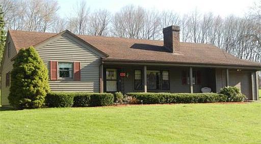 Comfortable one level home with spacious rooms and great living area has a cozy country feeling. Large sunny living room has a fieldstone full wall fireplace surround that is very charming. 2 large bedrooms, updated kitchen with stainless steel appliances, double ovens [refrigerator and dishwasher are only 2 years old, stove hood is new in 2014], a cozy dining area and built in hutches, wonderful enclosed sunroom porch with ceiling fan, cathedral ceiling, and awnings. There is a concrete pad for picnic table, 2 storage sheds, one with electricity that can be used as a workshop, tandem 2 car heated garage, and a large .8 acre yard for family fun, gardening or relaxing, are some of the other great features found here. There is a walk-up attic for storage or potential expansion. Conveniently located near shopping and bike path.