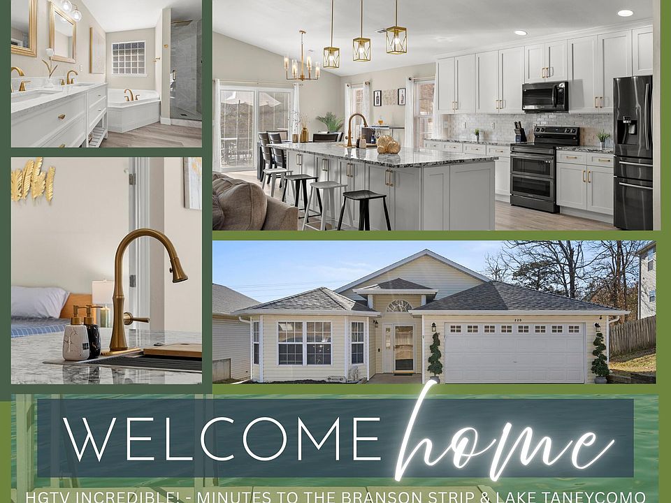Spring is in the air and so is the opportunity to own this HGTV-inspired, almost fully furnished lake & city-close single-family retreat built for the love of family, friends & unforgettable entertaining. Enjoy peaceful country vibes & nature setting, yet be just minutes to two lakes, the Mark Twain National Forest, and Branson's world-class dining, shopping & endless adventure.This everything-on-one-level stunner features a massive open-concept great room with sky-high vaulted ceilings and oversized windows flooding the home with natural light. A grand living space built to host your entire tribe anchors the heart of the home, centered by a 10-foot granite island, timeless black stainless appliances, newer crisp white shaker cabinetry, & warm, sleek gold fixtures. Both island & formal dining spaces make hosting effortless...because we all know all the best gatherings end up in the kitchen!A light & airy paint palette pairs beautifully w/ warm wood LVT tile throughout, offering elevated style with easy everyday care. The expansive living area also includes a bonus flex space perfect for a children's play zone, home office, or creative studio.Elegant French glass doors lead to a luxurious owner's retreat with tray ceiling, spa-level ensuite, dual sinks, quartz counters, soaking tub with jetted hookups, oversized rainfall walk-in shower, and a custom-designed walk-in closet. A thoughtful split-bed plan offers three additional spacious bedrooms ideal for guests, kiddos, or work-from-home plus a beautifully updated second full bath.Step outside to newer open-air deck overlooking a spacious privacy fenced backyard--perfect for yard games, barbecues,& stargazing. Even better, low HOA dues include community pool, children's play area, water/sewer & mowing all summer long!Updates include: new roof, garage door opener, water softener, light fixtures & so more.A rare blend of comfort, design,& location--new cherished memories await @220 Deer Run.