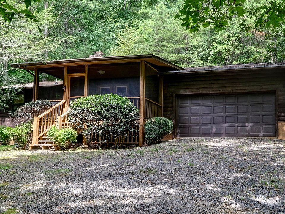 A LOG home with a GARAGE surrounded by nature and privately situated at the end of the road is waiting for you! This 2 bed, 2 bath home is a mere 5-10 minutes from town and features an open floor plan with a unique combination of wood & sheetrock inside to brighten up your spaces. Great Room has wood floors and a wood burning fireplace to warm chilly North Carolina evenings. Kitchen located next to your dining area is open to a bonus room that can be a sitting room, office or whatever your needs are. Down the hall conveniently located is your laundry, guest bed, bath and Master Ensuite. An open deck in the back for BBQs. This is the perfect place to call home in the mountains of NC!