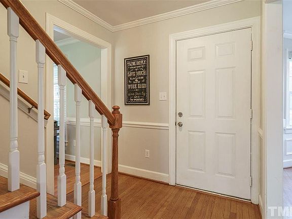 Charming FRONT PORCH Home in Desirable Cary w/SideEntry Porch. Beautifully LANDSCAPED on Lrg FENCED Lot. Extensive MOLDING & UPGRADEs thruout. HARDWOODs on Main Fl, Stairs & 2nd Fl Hallway. Kitchen features GRANITE, Subway TILE Backsplash, SS Appls, Cabinets-aplenty, Built-n Buffet & Roomy Nook. Spacious FR w/Brick Fireplace. KingSize MASTER Retreat w/Walk-n & LUXURY Bath. Nicely Appointed Secondary Bdrms. 3rd Flr ATTIC. NEW Deck & STAMPED Patio. Home WARRANTY. Black Creek Greenway Access Closeby. & More!