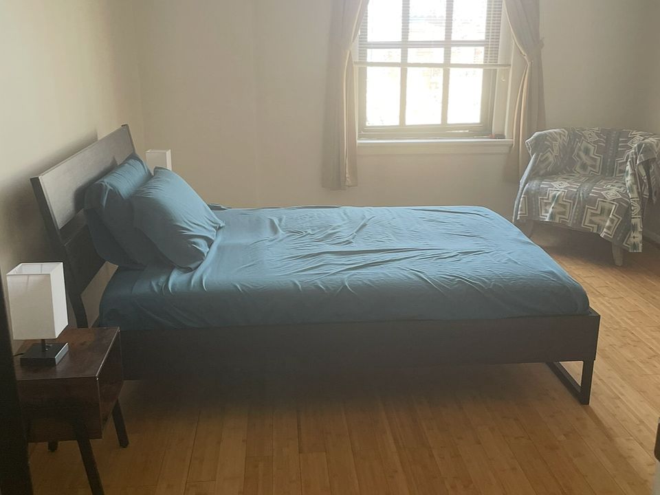 Spacious 1BR/1BA apartment in the heart of Charles Village. Hardwood floors, huge windows, walk in closet, central air and heat, tub/shower, dishwasher, garbage disposal, granite countertops, stove/oven, microwave. Fully furnished-couch, chair, coffee table, lamp, kitchen table and chairs, tv stand, full size bed, two night stands, two bedside lamps, kitchen accessories. one year lease starting June 1st, with some flexibility. Tenant responsible for electric and internet.