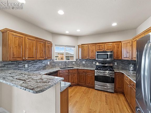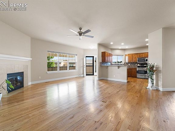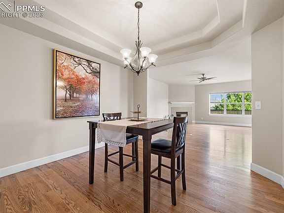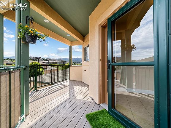 What a wonderful view of Pikes Peak from the new porch deck with retractable awning. See Cheyenne Mountain from the kitchen. There's so much glorious light throughout. *Yes, this home has an elevator! Not many homes in the community do. The home is situated at the back of the community for more privacy, plenty of guest parking, and access to trails. The primary bedroom has a patio door leading to a back porch with its own dog run. Have your agent call us for more information and to set an appointment.