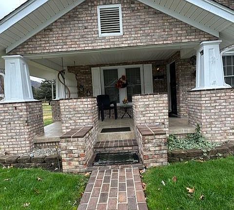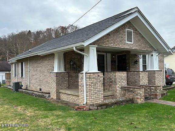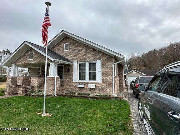This home has a brick exterior, with 3 bedrooms and 2 full bathrooms, living room, family room, kitchen with breakfast bar, kitchen appliances stay with home plus washer and dryer; the kitchen has amazing custom cabinets including a built-in pantry; laundry room is centrally located in home; the formal dining room has beautiful wooden French doors leading into living room. The fireplace in the living room was closed off when the new roof was put on home about 7 years ago. There is a pull-down ladder for easy access to attic. The one car detached garage had a new roof put on summer of 2023, the garage has a workshop room with a hand sink for convenience and also a small storage room in the garage. This home has a covered front porch and a deck on back of home. Home has central heat and air, internet and cable available, city water, city sewer, gorgeous mountain views, level yard, sidewalk and concrete driveway, seller is willing to sell some of the furniture to buyer. This home has been well taken care of and is move in condition, possession at closing.