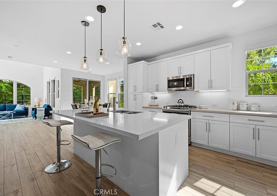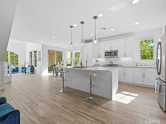 NO MELLO ROOS!! Welcome to this beautiful 3 bedroom with loft (could easily be converted to 4th BR), 2.5-bathroom home located in the prestigious Baker Ranch community of Lake Forest. Walk into a first floor that showcases upgraded ceramic tile flooring that flows through the living area including kitchen, dining area and a family room with a soaring cathedral ceiling. Large windows throughout allow natural light, while taking in the lush green hillsides right outside. The upgraded kitchen includes beautiful shaker cabinetry with pull-out shelving, GE Profile stainless steel appliances and an oversized white quartz island with bar stool access. The 2nd level includes 2 hallway bedrooms with a shared hallway bath. Beautiful glass "barn doors" open to your convenient laundry area which includes sink and ample cabinet space. The master suite includes a large walk-in closet, ensuite bath containing dual sinks with a beautiful tile backsplash. Large windows in Master Bedroom again allow plenty of natural light with calming views of the green hillsides. The third level consists of a multi-purpose loft which can easily be used as an office, play area or exercise room. Home features tankless water heater and the garage is prewired for EV Charger! Home sits on a corner lot that affords a private and functional wrap-around fenced yard perfect for entertaining, children's play area and or a pet refuge with both hard scape and natural grass area. The many amenities of Baker Ranch include pools, spa, 2 club houses, tennis and basketball courts as well as walking and hiking trials. Close to shopping and dining. This is a must see. Make that Wise Choice and visit us today!