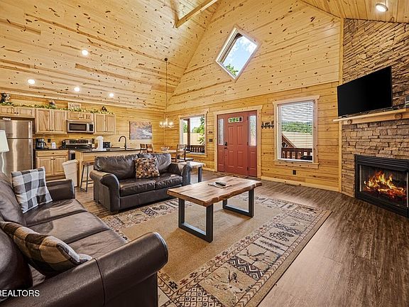 This turnkey 2-bedroom, 2-bathroom log cabin offers rustic elegance with modern amenities. Nestled within the serene White Oak Resort just outside of Gatlinburg, this cabin presents a remarkable investment opportunity or personal retreat. Backing directly onto the Great Smoky Mountains National Park, the property ensures unparalleled privacy with no future development behind you. The cabin features an all-wood interior, cathedral ceilings, and a stone gas fireplace, creating a warm and inviting atmosphere. The open-concept kitchen is equipped with stainless steel appliances, granite countertops, and a spacious island, perfect for entertaining. Having an ideal bedroom set-up of two primary suites conveniently located on the main level, each providing comfort and privacy. A spacious loft serves as a versatile game room and offers access to an upper deck, perfect for relaxation and entertainment. Outdoor living is enhanced by a covered front porch and expansive screened-in decks accessible from both suites, providing serene mountain views. The cabin is accessible via well-maintained roads without steep inclines. As part of the desirable White Oak Resort community, owners have access to amenities such as a swimming pool, fitness center, tennis courts, walking trails, and propane grills. The cabin's proximity to downtown Gatlinburg, Bent Creek Golf Course, and various recreational activities further enhances its appeal. Embrace the tranquility and luxury of mountain living with this turnkey property offering both serenity and investment potential.